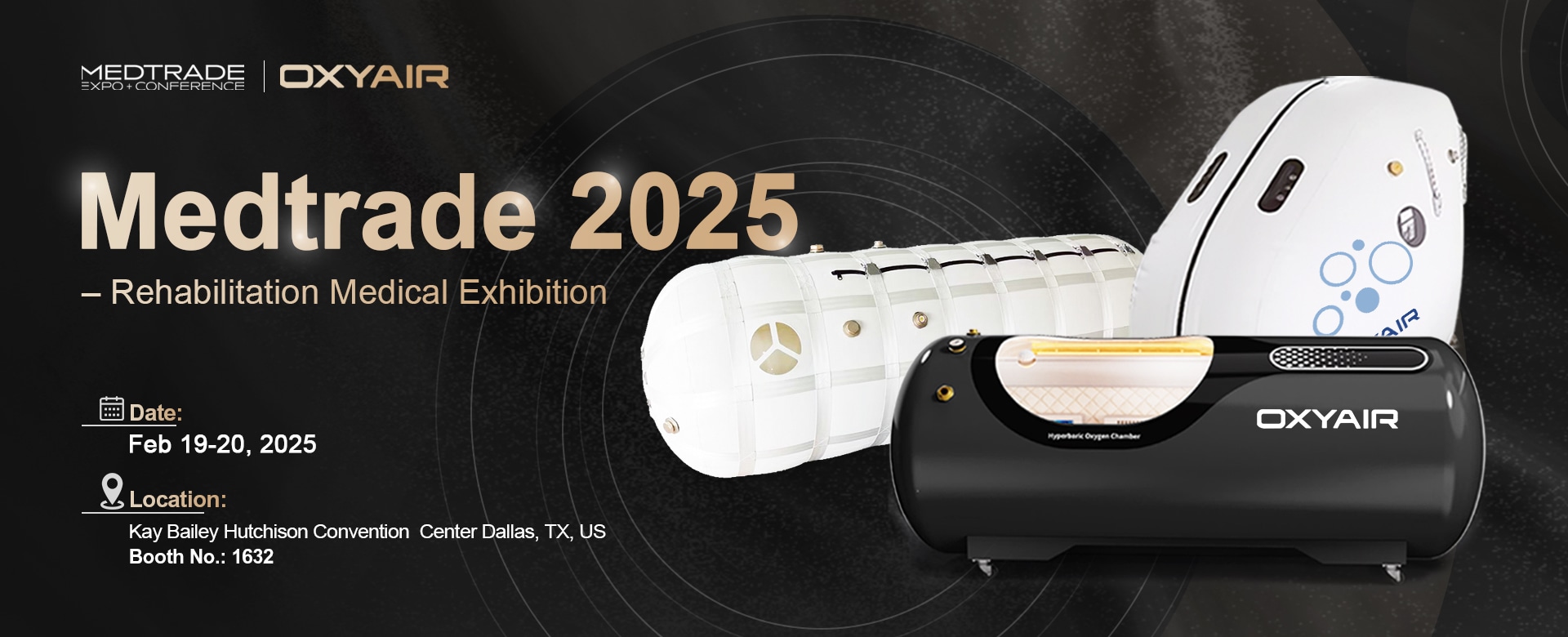 Highlights of Oxyair at Medtrade 2025 · Hyperbaric oxygen chamber: assists rehabilitation treatment and is widely used in sports recovery, chronic disease management, not, and other fields. · Oxygen concentrator: suitable for home rehabilitation use, highly recognized by medical industry experts. · Innovative oxygen production technology: using advanced oxygen concentration technology to provide high-purity oxygen to meet different medical needs.
