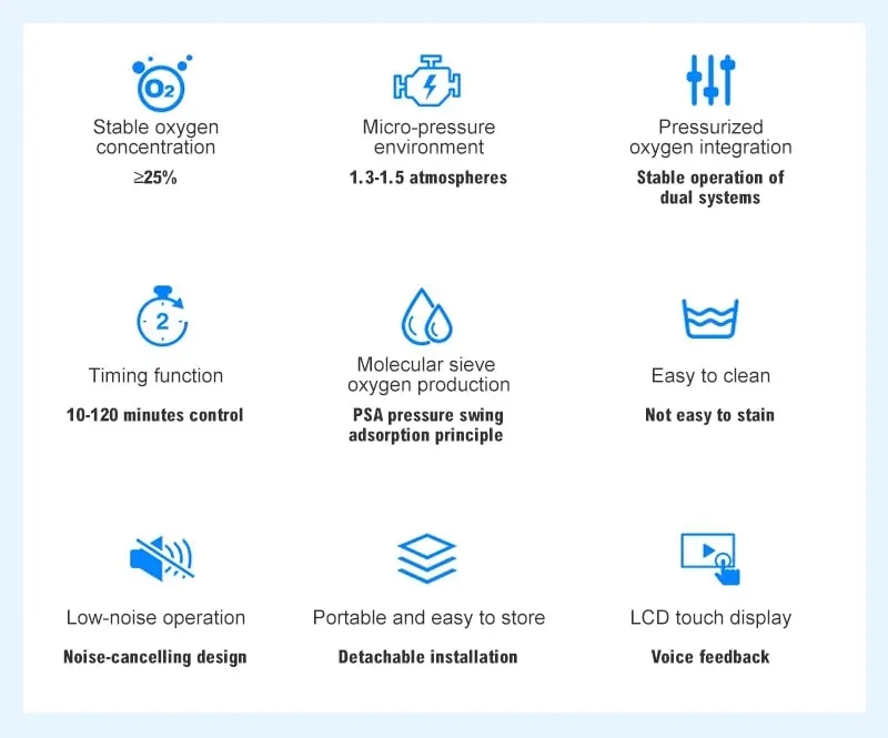 La cámara está equipada con un concentrador de oxígeno de 10 litros, lo que garantiza un suministro de oxígeno constante y de primer nivel durante toda la sesión.