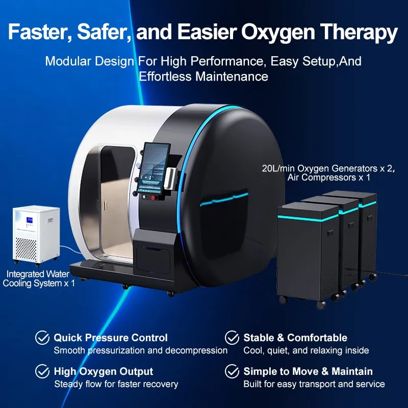 The modular setup — with separate chamber, oxygen, and control systems — makes transport, installation, and future maintenance simple and cost-effective.