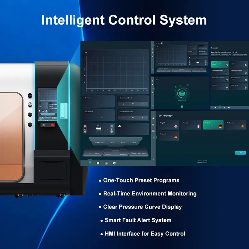 Dual oxygen and pressure modules deliver steady, high-performance airflow, giving the chamber strong, reliable power every session.