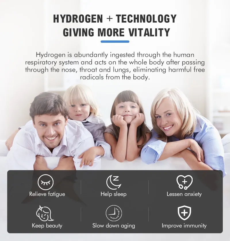 Debido a que el gas hidrógeno tiene un volumen muy pequeño, tiene una penetrabilidad muy fuerte y puede penetrar rápidamente la membrana celular y entrar en el núcleo celular. Tiene propiedades antiinflamatorias y bactericidas y tiene un muy buen efecto terapéutico en las enfermedades pulmonares. Al mismo tiempo, puede acelerar el metabolismo y mejorar el sueño.