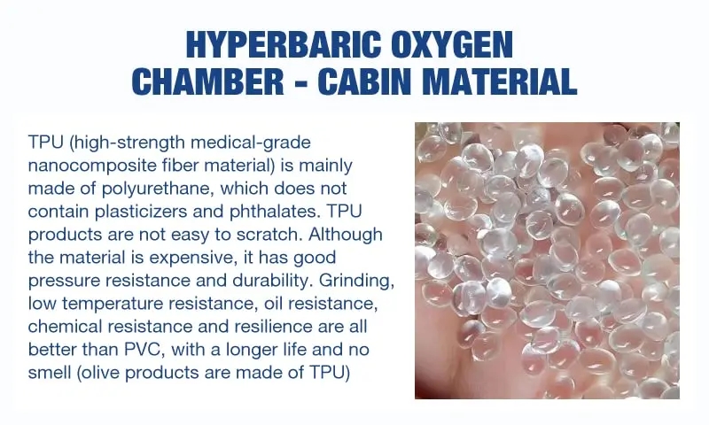 Sumérgete en los beneficios del TPU, el principal material detrás de la cámara de oxígeno. El TPU, una fibra nanocompuesta de grado médico de alta resistencia, se distingue por su falta de plastificantes y ftalatos, lo que la hace resistente a los rayones. Superior al PVC en términos de vida útil, resistencia a los elementos externos y ausencia de olor, la calidad del TPU queda subrayada por su uso incluso en la fabricación de productos oleícolas.